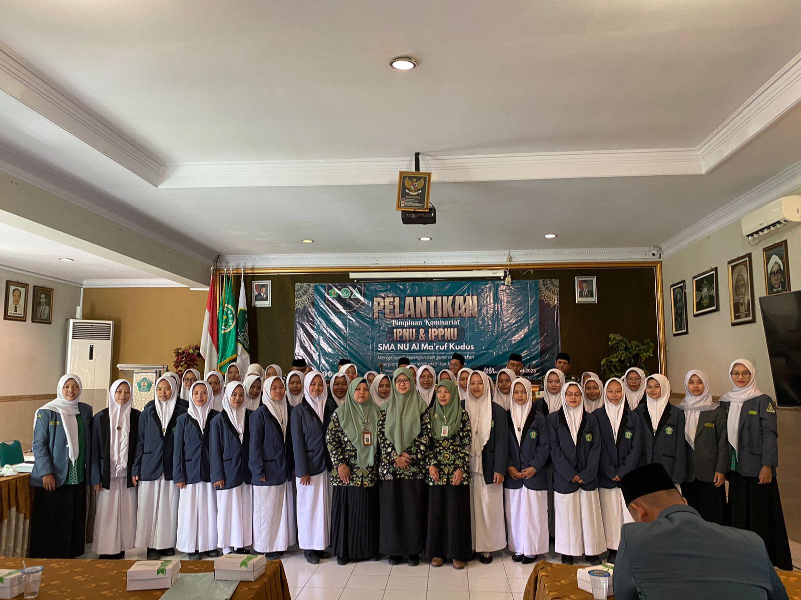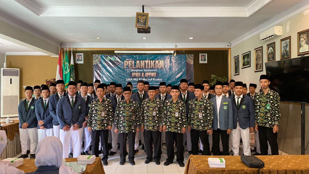 Pelajarkudus.com- Aula SMA NU Al-Ma’ruf Kudus pada Sabtu, 17 Mei menjadi saksi khidmat digelarnya pelantikan Pengurus Ikatan Pelajar Nahdlatul Ulama dan Ikatan Pelajar Putri Pelajar Nahdhatul Ulama (IPNU-IPPNU) Komisariat SMA NU Al-Ma’ruf Kudus. Diawali dengan bacaan Al-Fatihah. Acara Pelantikan ini dilanjutkan dengan sambutan motivasi, Pelantikan, do’a bersama, serta sesi foto bersama. Tidak hanya sebatas ceremonial. Acara ini menjadi momentum penting dalam merefleksikan peran pelajar di kehidupan sekolah dan bermasyarakat.